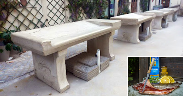 | La raffinata vasca in pietra alimentata con acqua corrente è situata in fondo alla serie dei quattro banchi di vendita. |